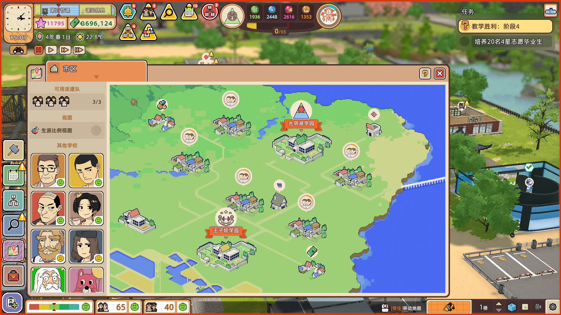 这是一款轻松幽默的校园建造模拟游戏,在游戏中,你受老校长之托承担起复兴母校的光荣任务。作为新晋校长,你不仅需要建造风格化学校,还需要培养老师,招募学生,开展趣味课程,处理随机事件,最终打造理想的个性化学府。